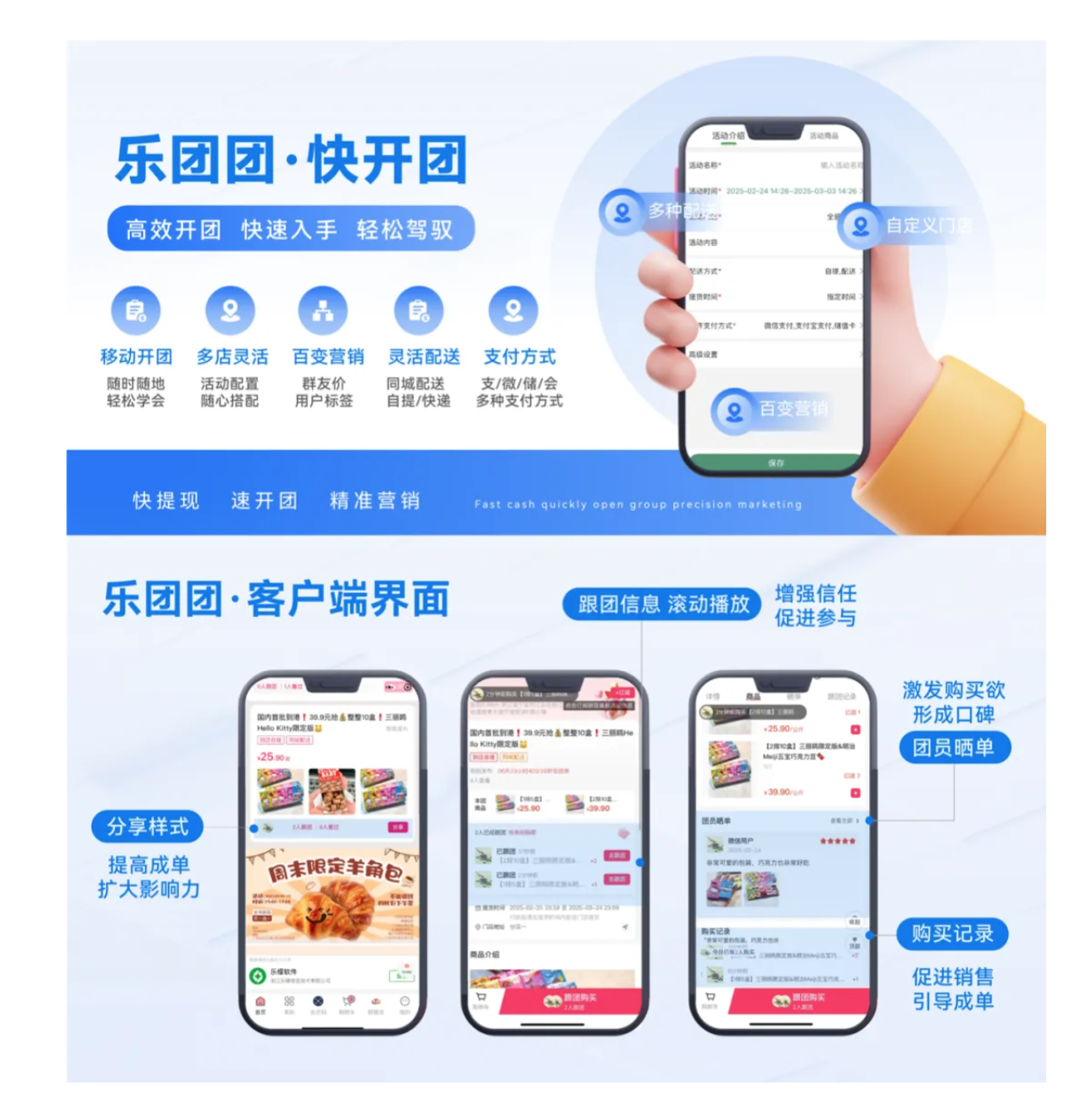 支持移动端随时随地开团,新手仅需2分就能学会。同时支持多门店活动灵活配置,百变营销,群友价、群体标签、活动分享便捷,助力企业快速爆单。高效开团,快速入手,轻松驾驭!